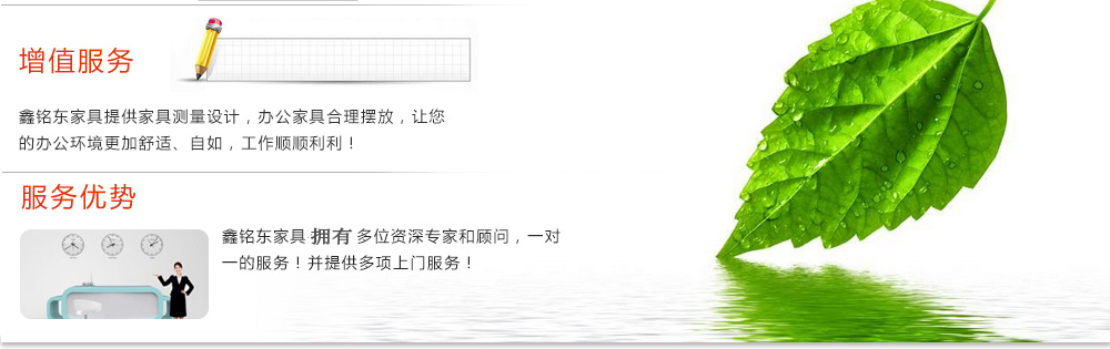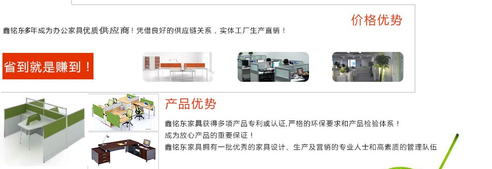 深圳市鑫銘東家具有限公司專業(yè)銷售各類辦公家具!產(chǎn)品涉及多種系列,如:班臺(tái)、班椅、屏風(fēng)、會(huì)議桌、會(huì)議椅、辦公沙發(fā)、茶幾、辦公桌、文件柜、電腦桌椅、各式餐臺(tái)、餐椅、書柜等辦公家具。 鑫銘東家具擁有一批優(yōu)秀的家具設(shè)計(jì)、生產(chǎn)及營(yíng)銷的專業(yè)人士和高素質(zhì)的管理隊(duì)伍。銘東家具以"先難后易"之戰(zhàn)略,在產(chǎn)品結(jié)構(gòu)、產(chǎn)品質(zhì)量及服務(wù)水平方面,均推陳出新,力求完善,精益求精。使我們的產(chǎn)品質(zhì)量保持在國(guó)內(nèi)外家具潮流的先進(jìn)水平,力求滿足客戶的特殊需求。鑫銘東家具多年來(lái)致力于環(huán)保、實(shí)用家具的設(shè)計(jì)與開發(fā),集生產(chǎn)、銷售、服務(wù)于一體。本著"以人為本"的設(shè)計(jì)理念,大量開發(fā)符合人體工程學(xué)的各種產(chǎn)品,以"誠(chéng)信為本"的質(zhì)量方針,真材實(shí)料,認(rèn)認(rèn)真真做產(chǎn)品,實(shí)實(shí)在在做人。鑫銘東家具更致力于創(chuàng)造"零維修率"的制造境界,實(shí)現(xiàn)"沒有維修的服務(wù)才是最好服務(wù)"的口號(hào)》了解更多